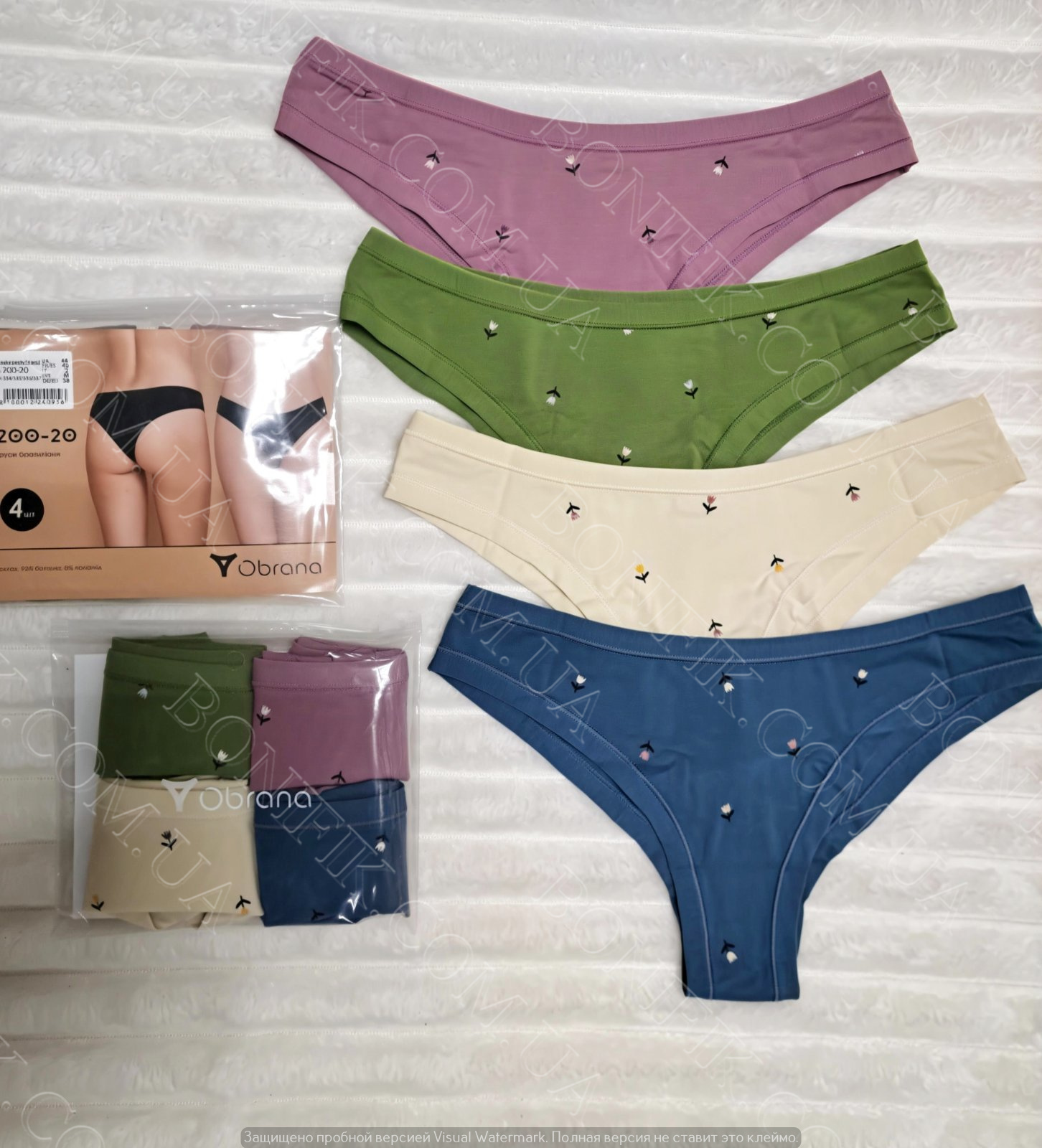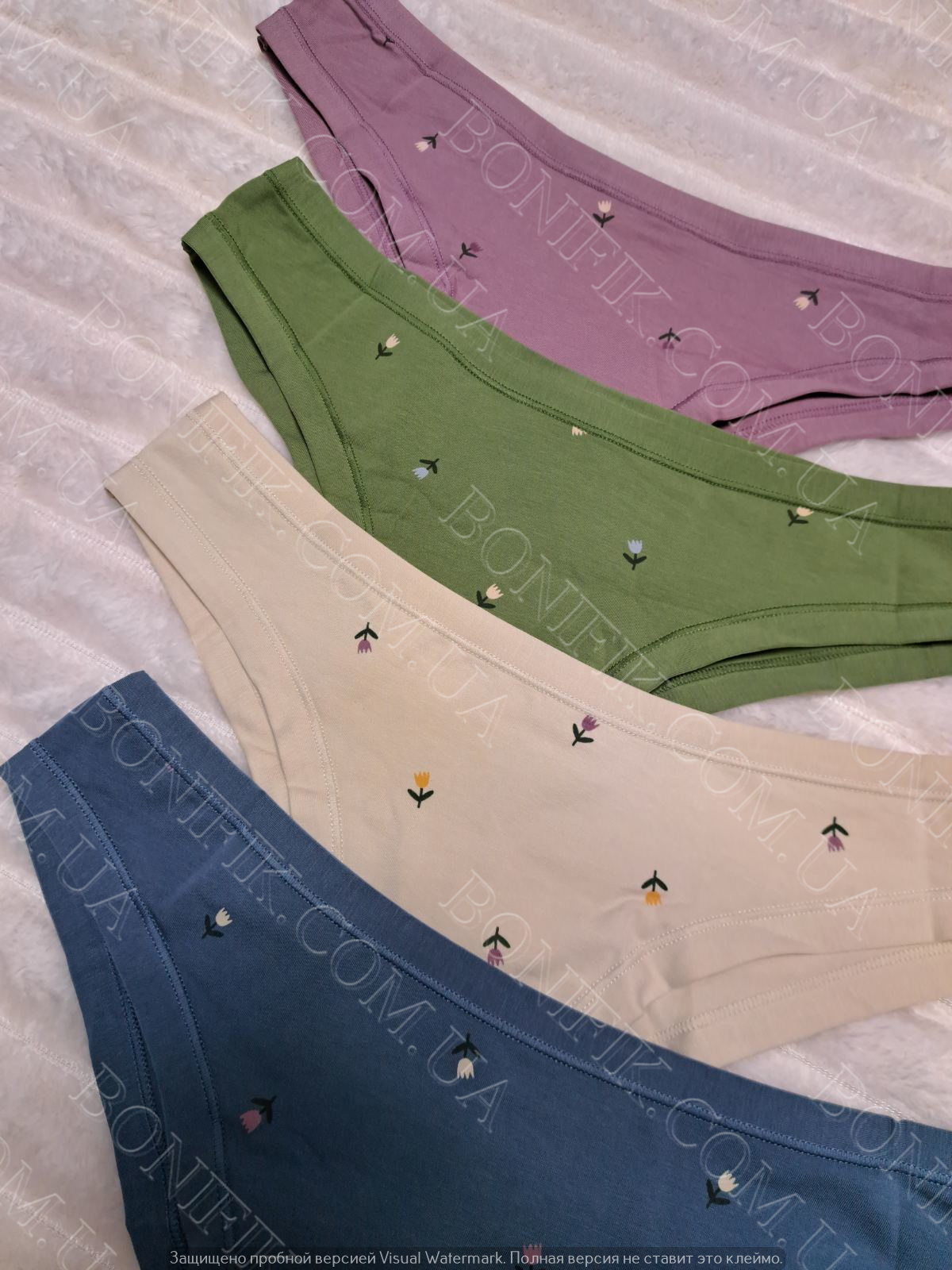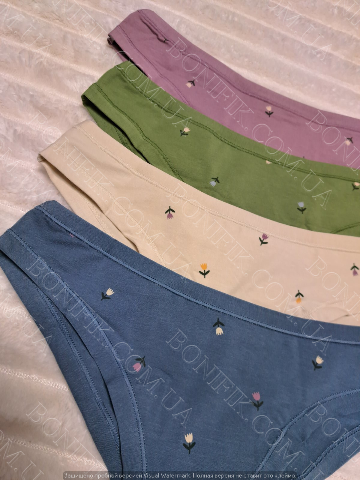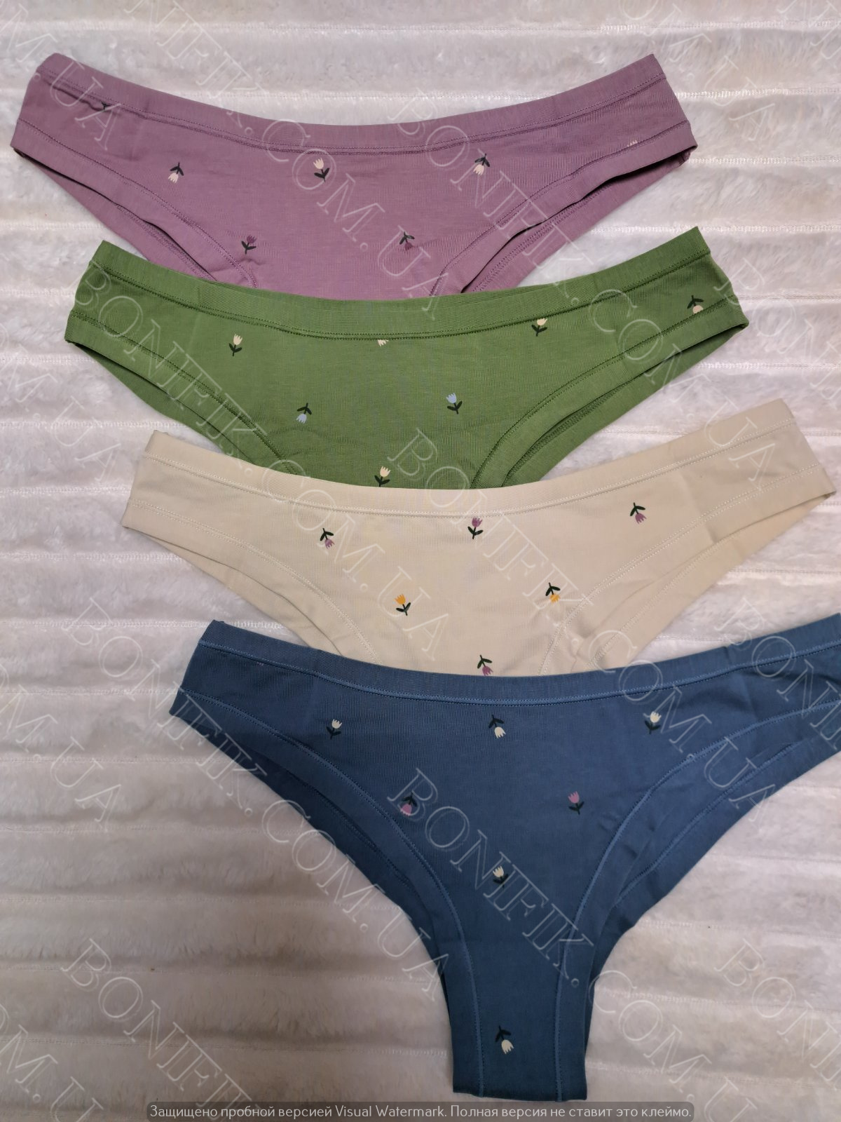 Набір жіночих трусів - 4 шт. в упаковці в різних кольорах (синій, натуральний, зелений, бузковий), прикрашений квітковим принтом.