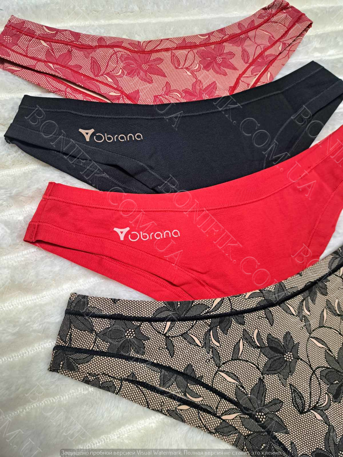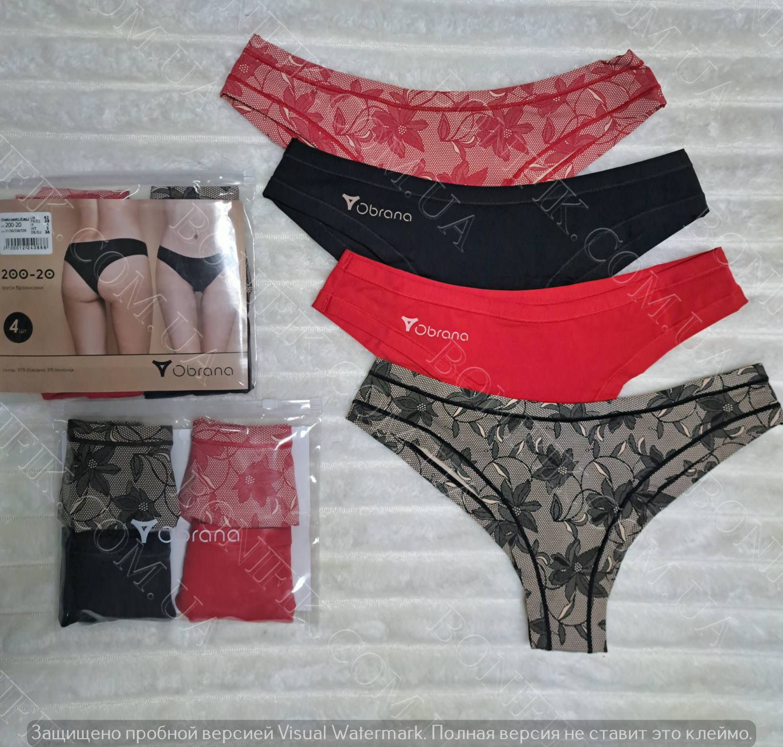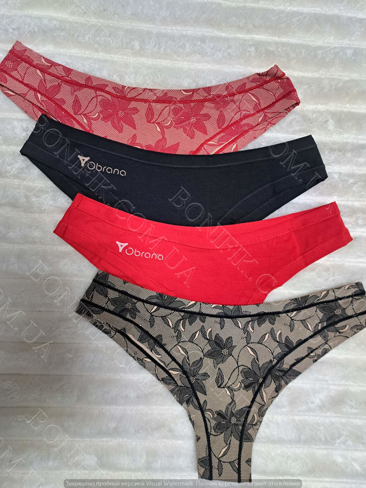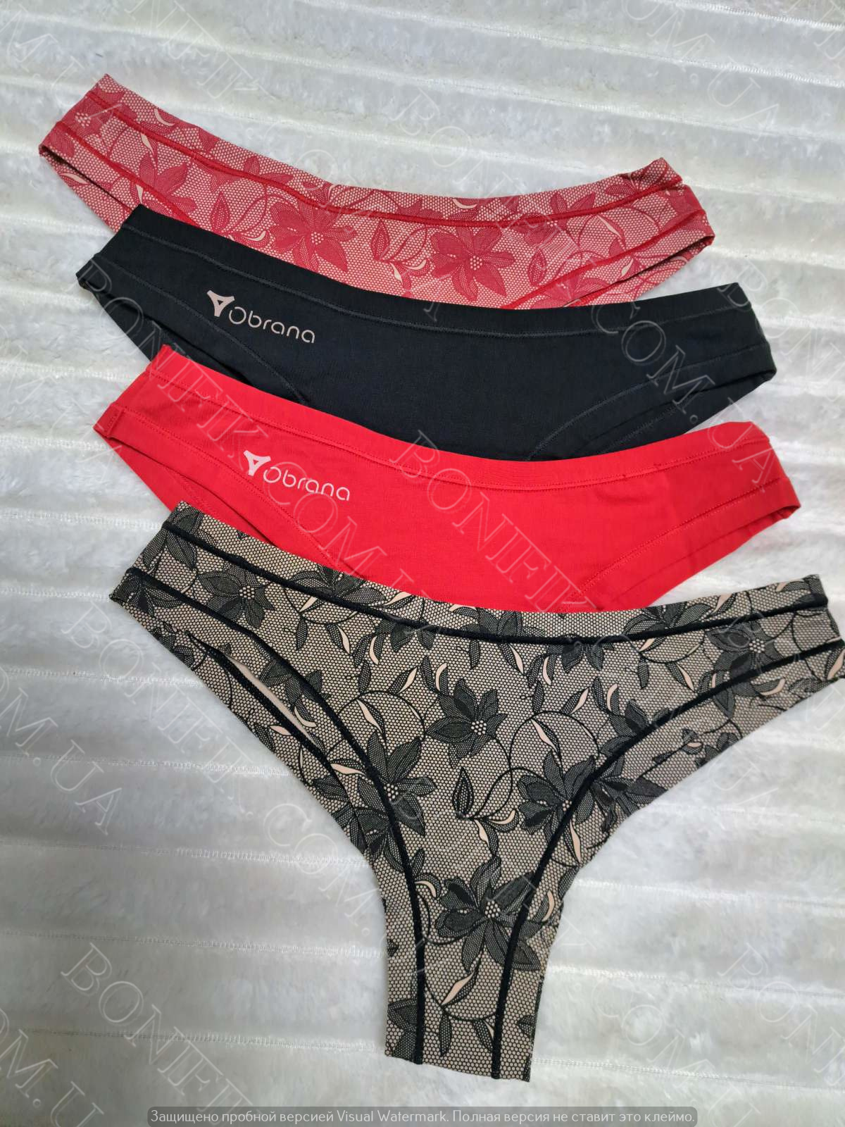 Комплект складається із 4 різнобарвних трусиків, двоє однотонні (чорний, червоний) та двоє бежевих декорованих квітковим принтом..