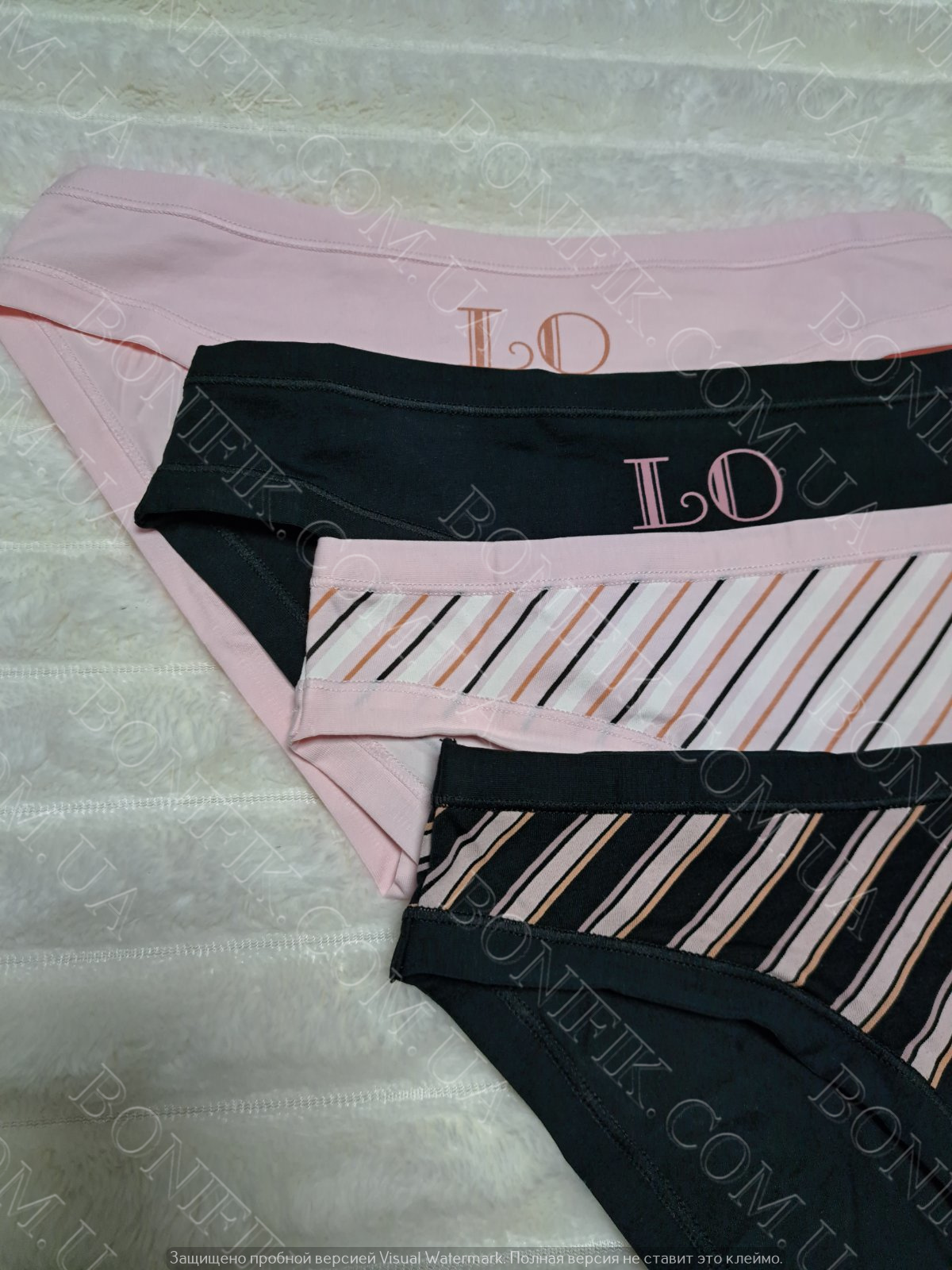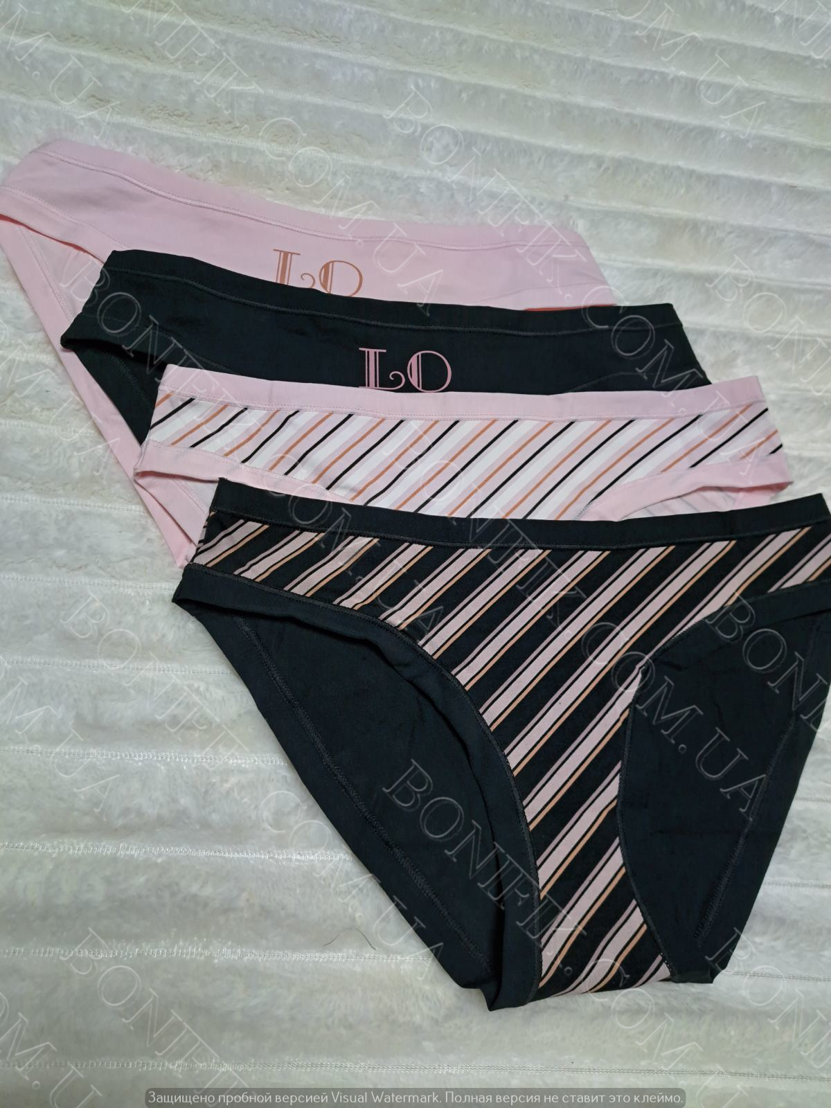 Вам представлена нова модель трусиків-сліп декоровані принтом в смужку та однотонні з написом "Love" в наборі. Жіноча білизна в упаковці із 4 шт. в асорті кольорів.