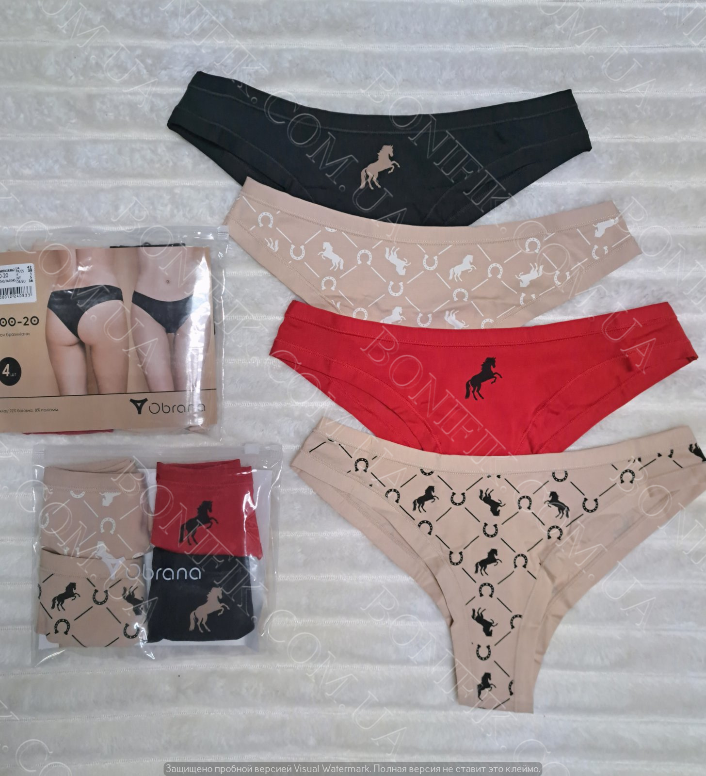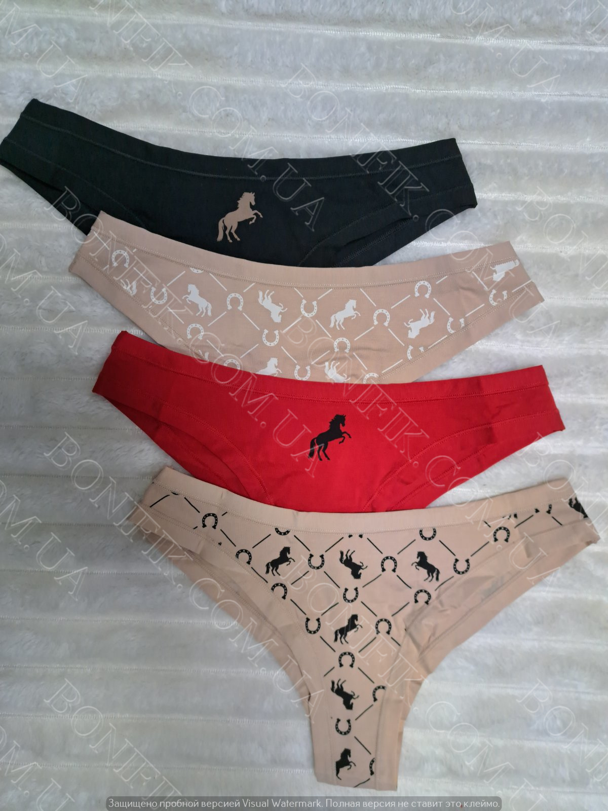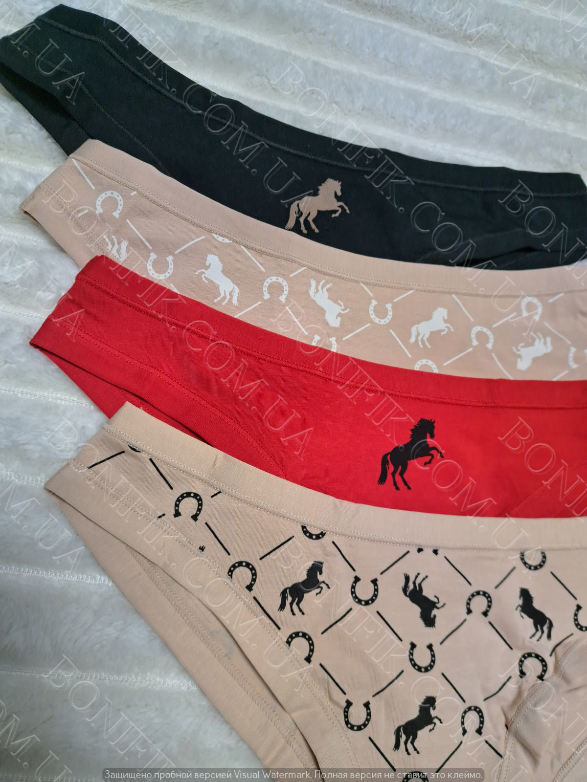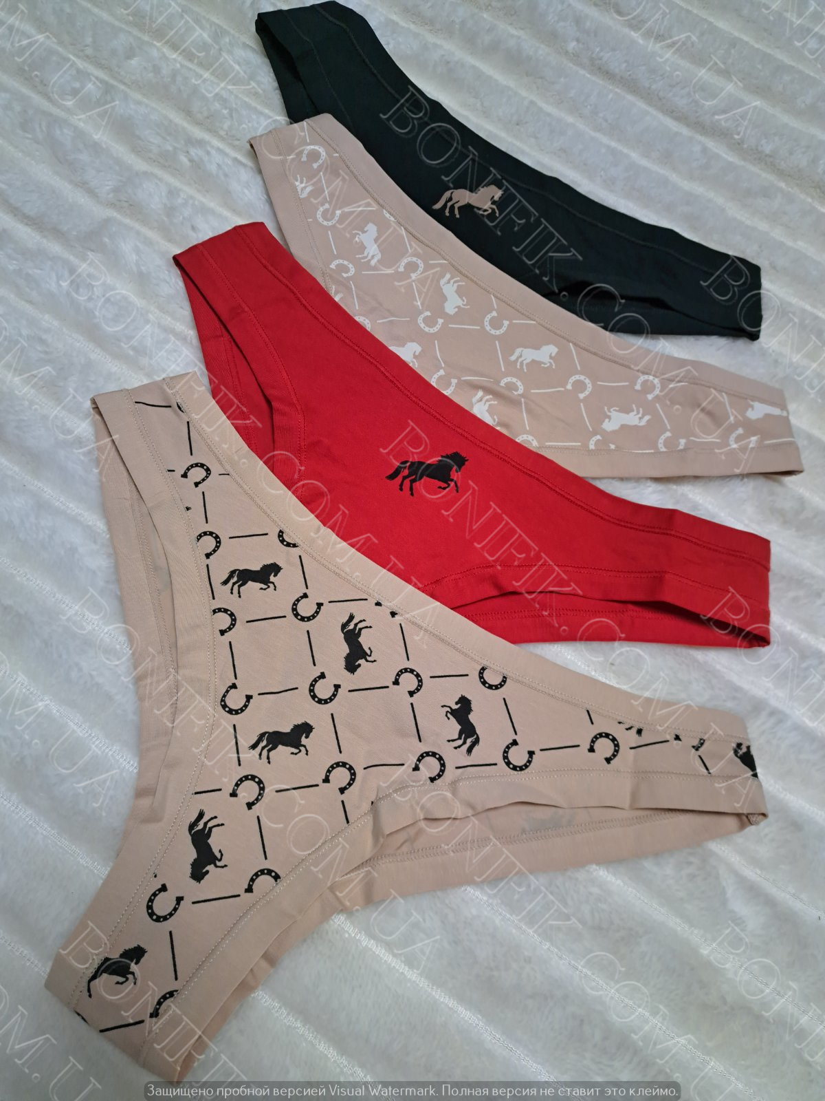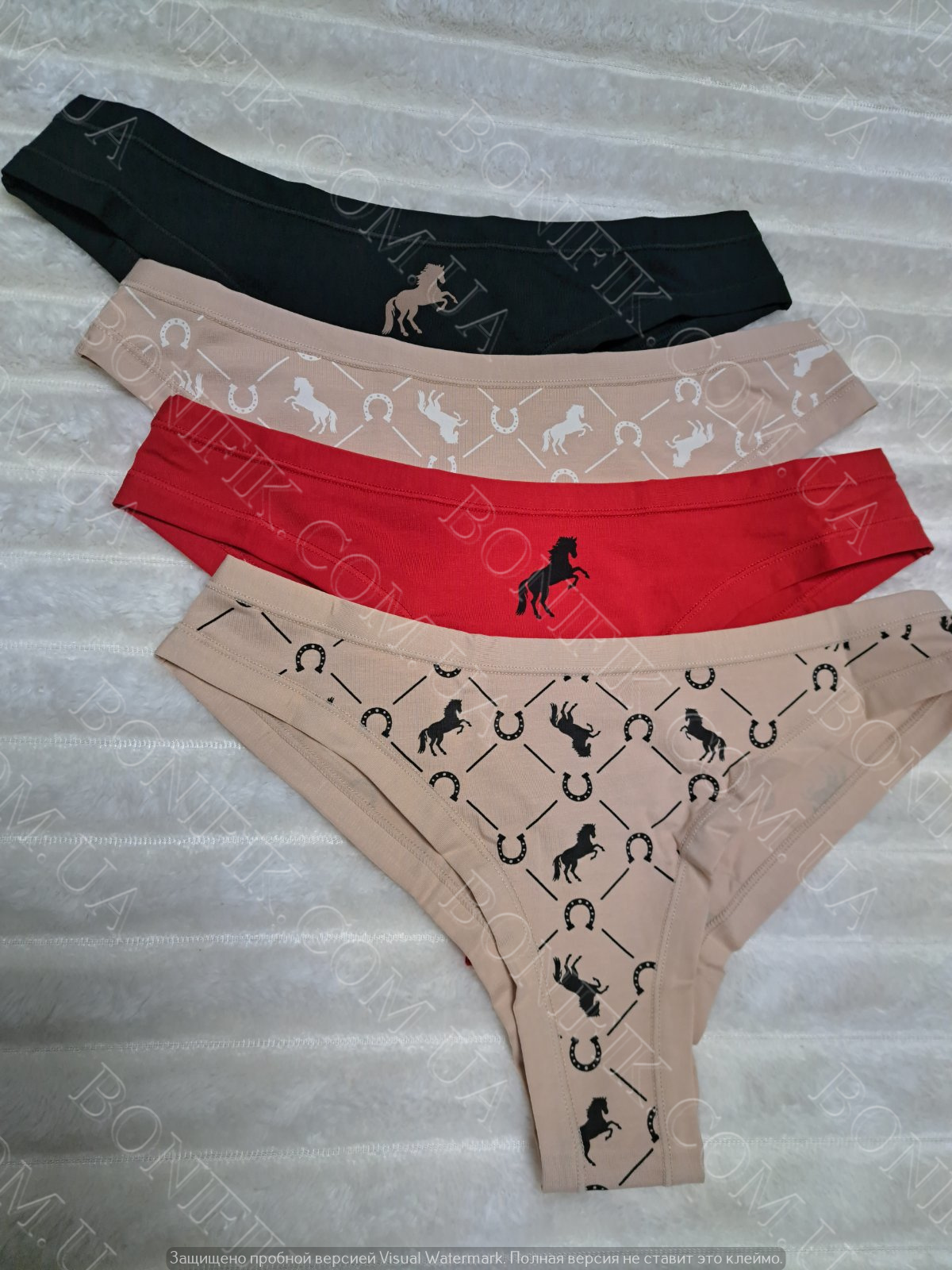 В упаковці із 4 трусів різного кольору з малюнком конячки і підков. Чудовий варіант для повсякденної носки в літній сезон.