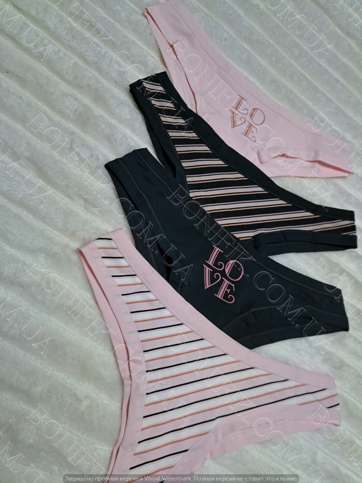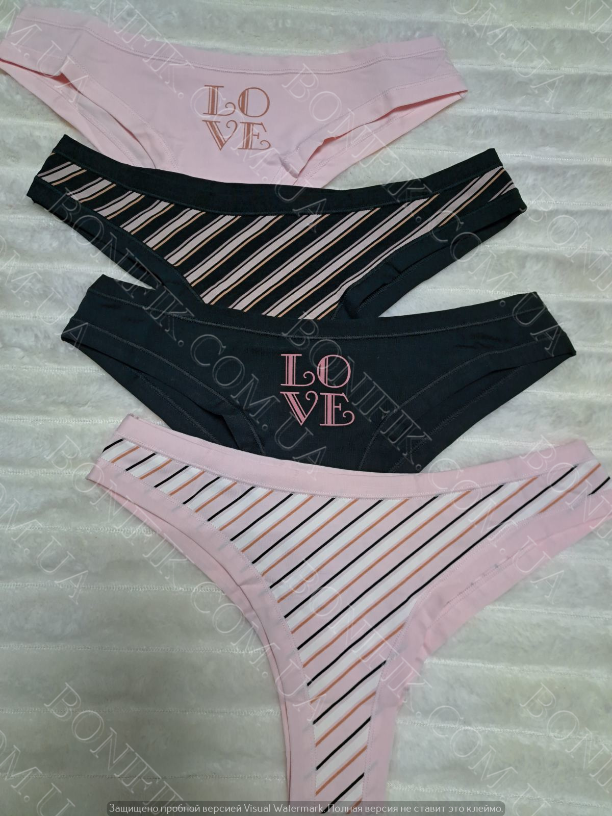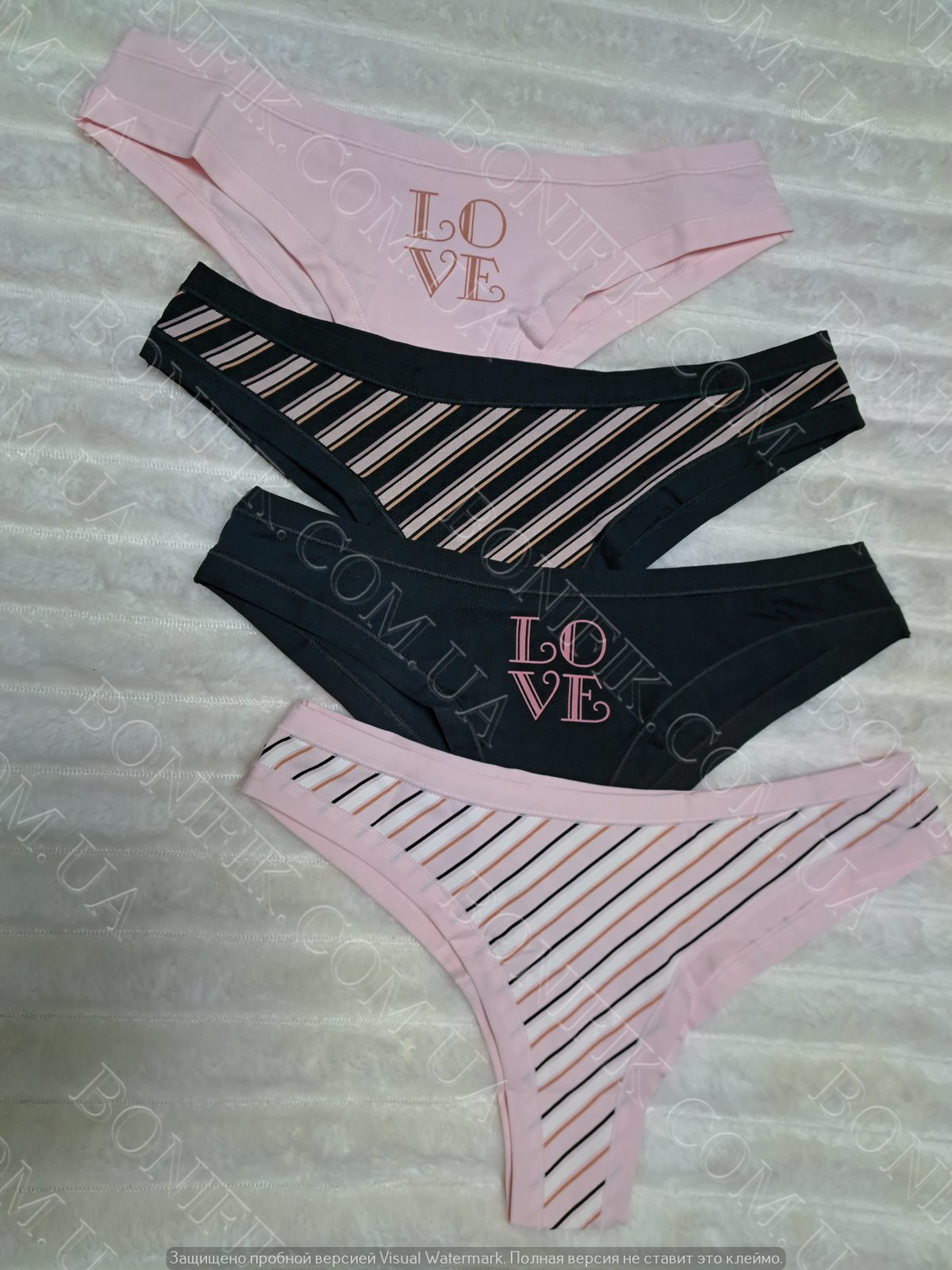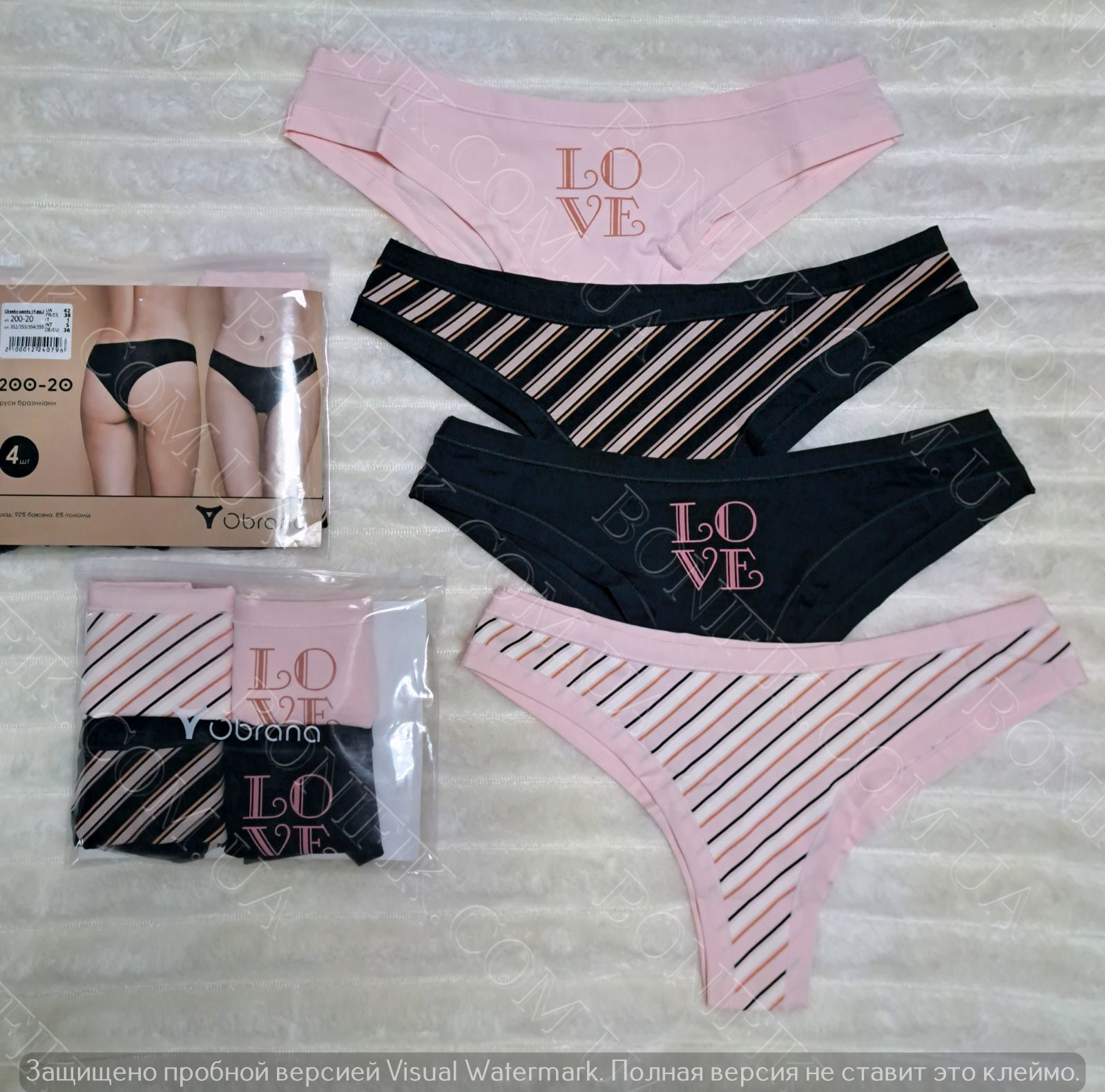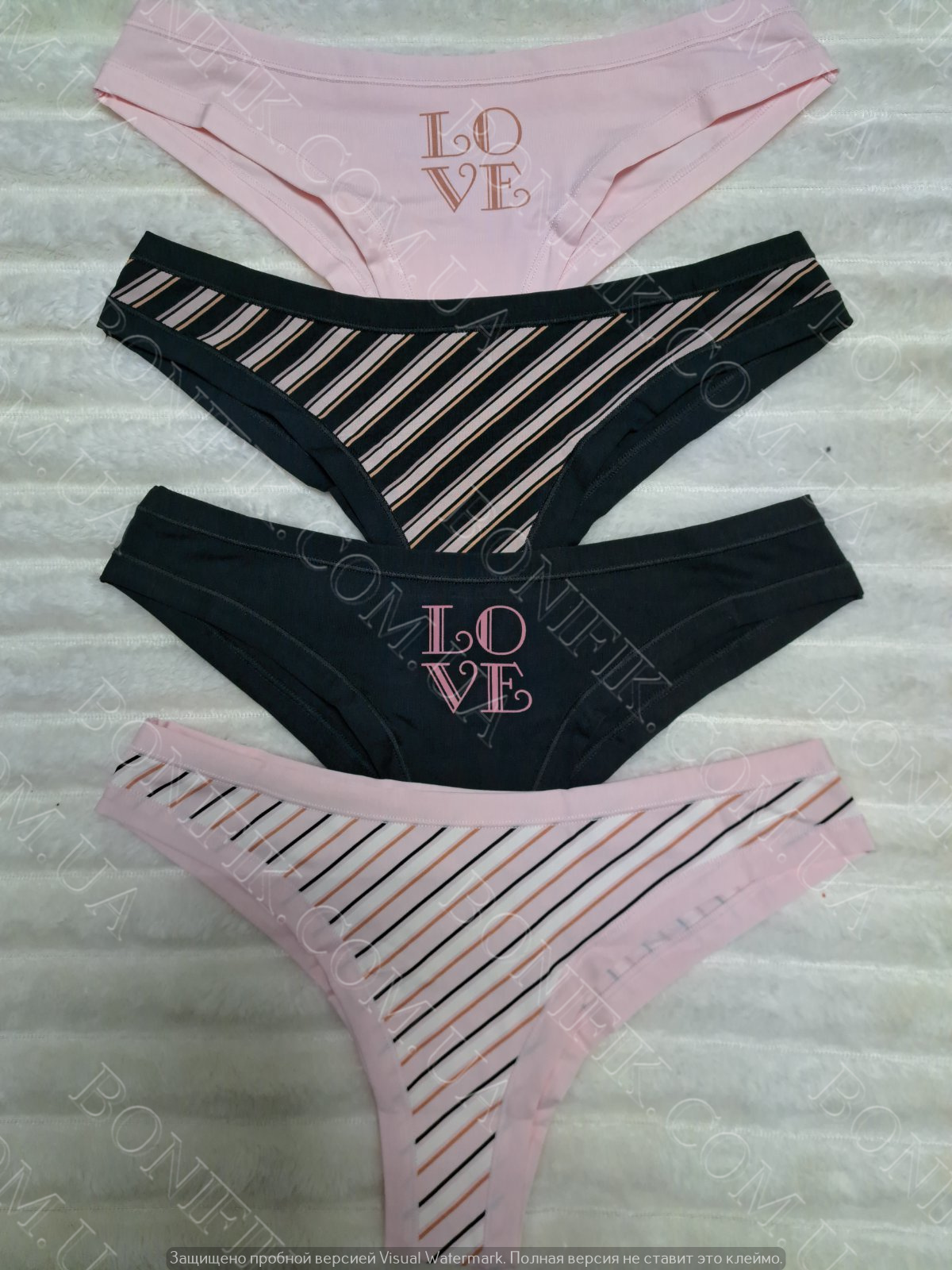 Бавовняні жіночі трусики-бразиліани (у наборі 4 штуки в упаковці) у палитрі кольорів (чорний, рожевий), декоровані принтом-написом LOVE і в кольорову смужку.