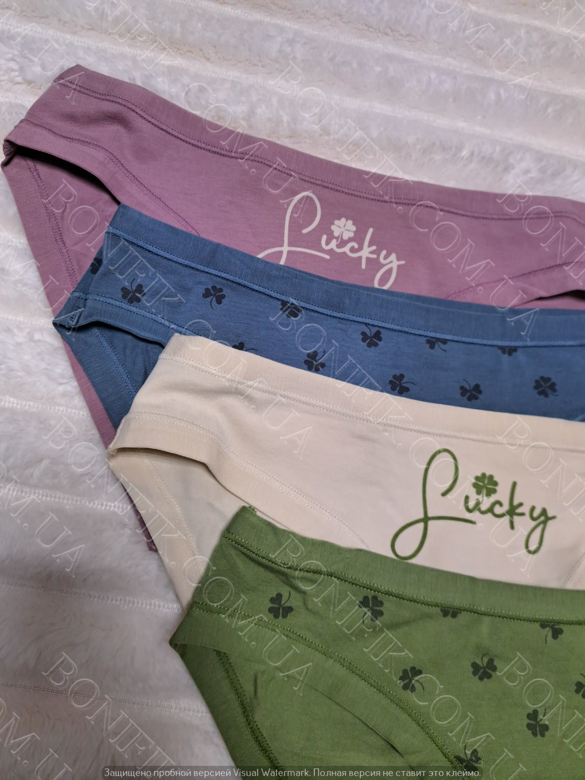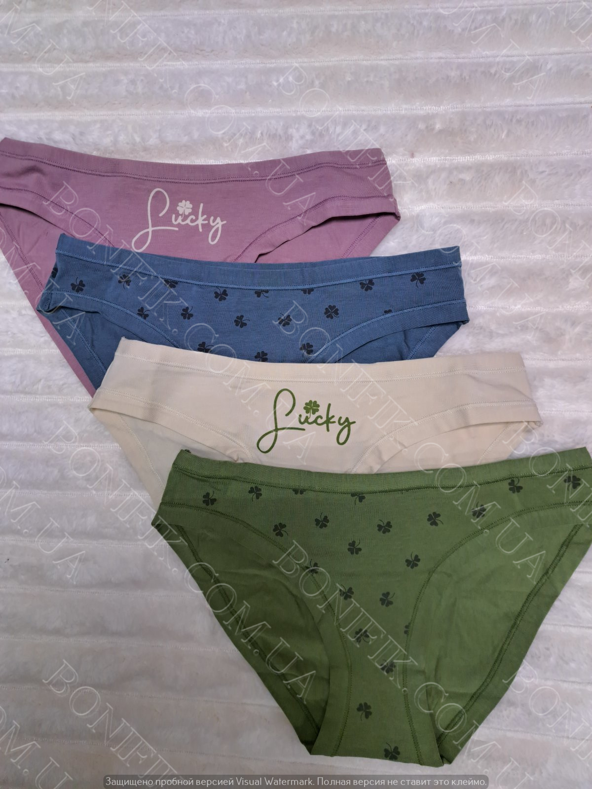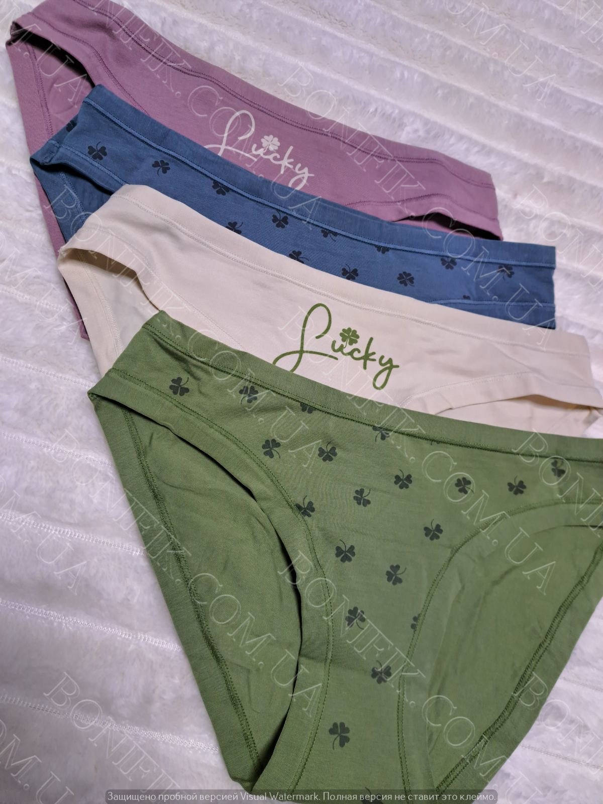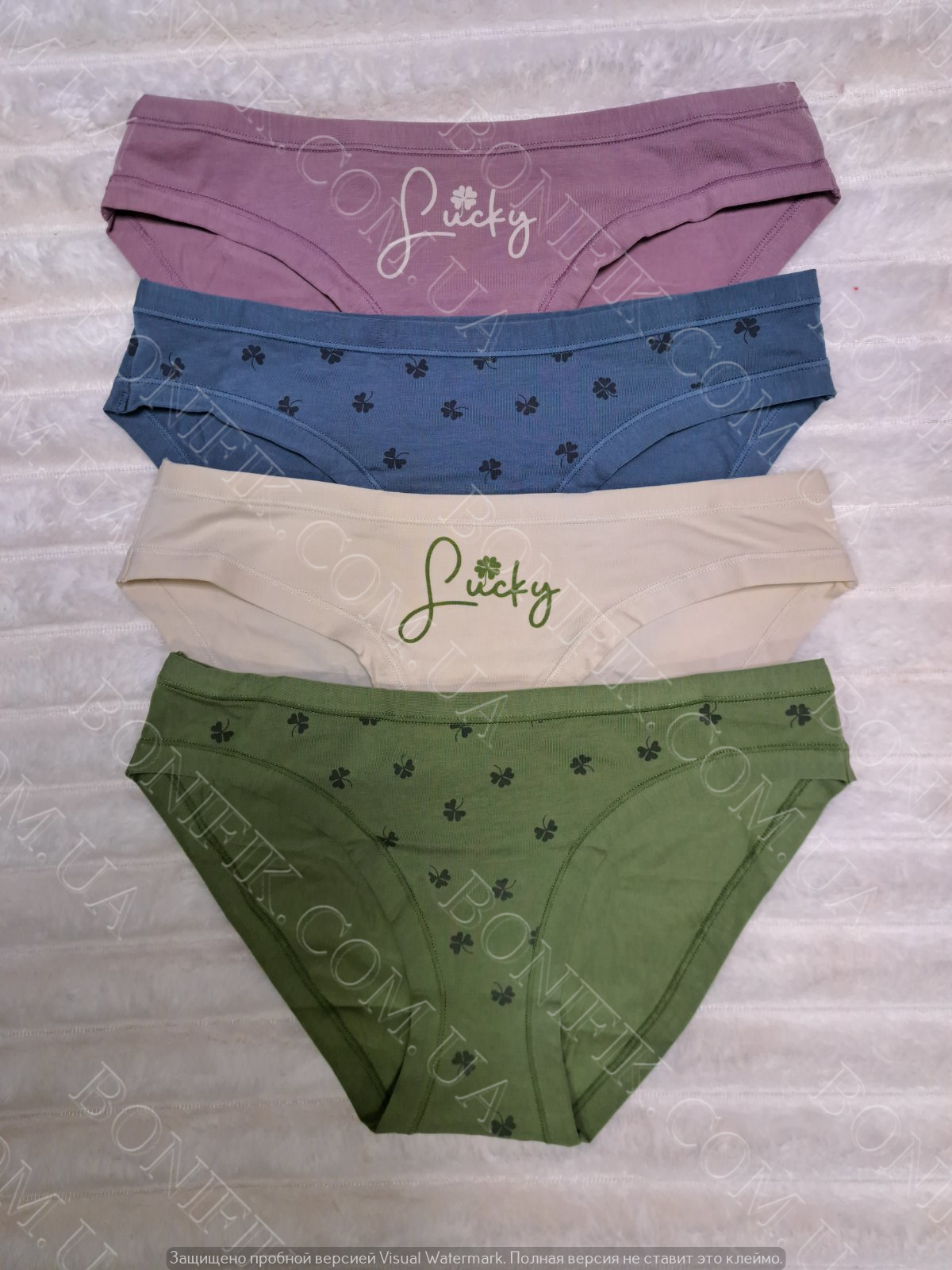 Комплект трусів-сліп складається із 4 кольорів з малюнком листочків і напису "Sucky". Виготовлені із бавовни з еластановою ниткою для збільшення розтяжності.