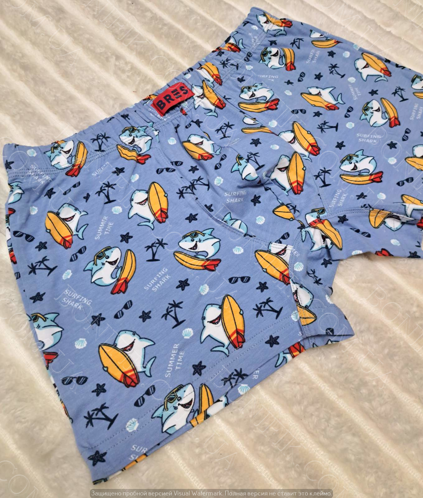 Блакитна тканина прикрашена яскравим літнім принтом – акули-серфінгісти, дошки, пальми і сонячні мотиви, що додають настрою і роблять білизну надзвичайною.