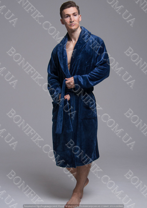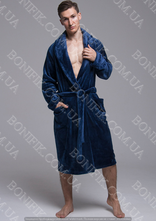 Елегантний комірець-шалька, пояс на талії та глибокі кишені роблять халат не тільки зручним, але і по справжньому чоловічим.