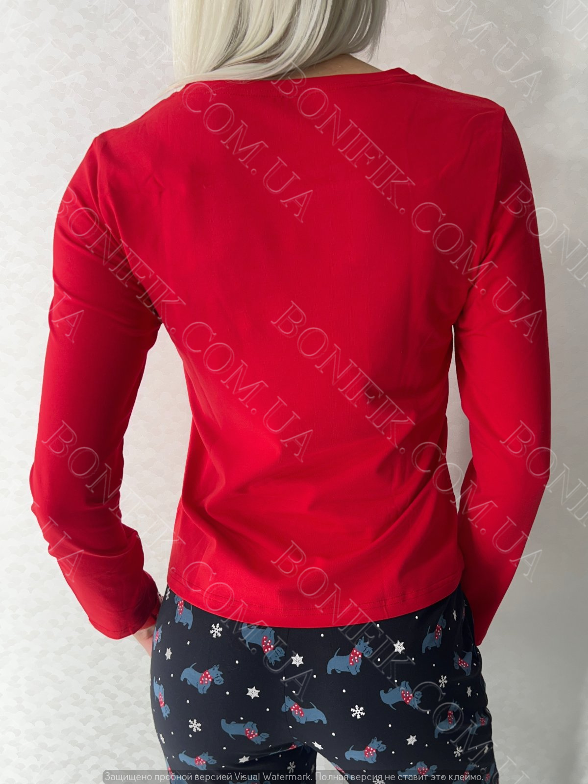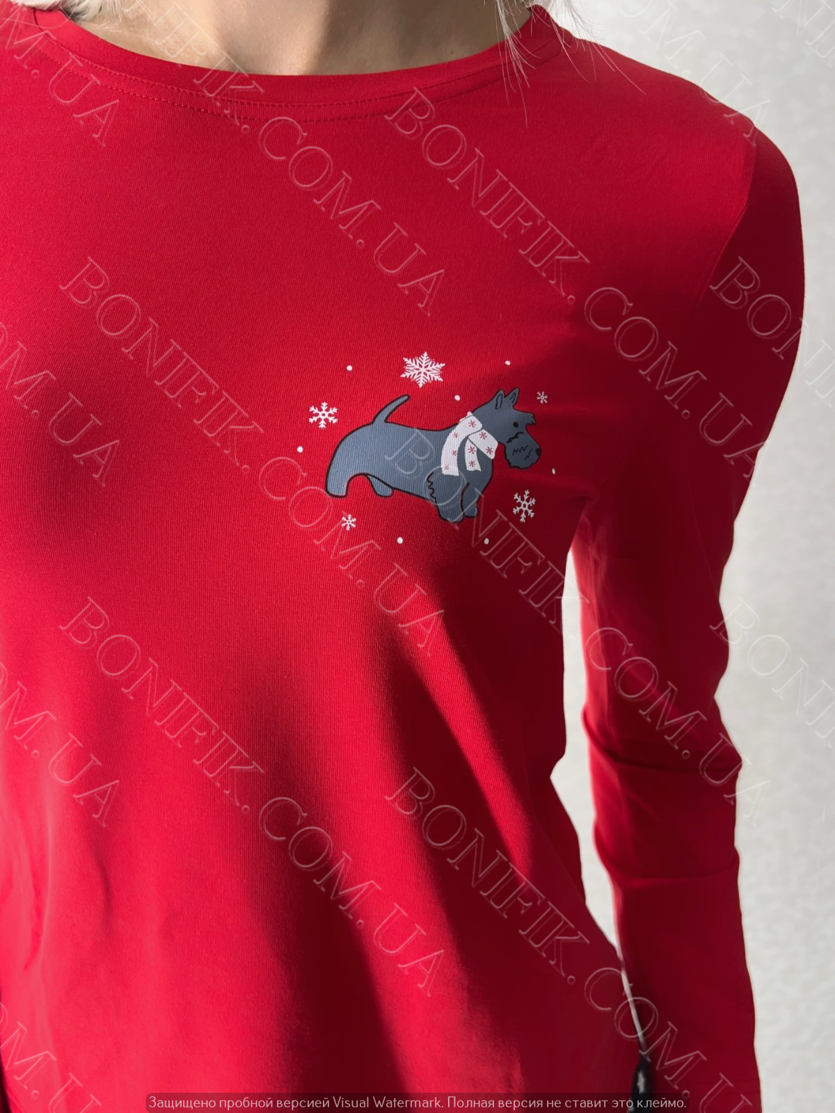 М'який лонгслів насиченого червоного кольору одразу зверне увагу — він не тільки виглядає святково, але і піднімає настрій завдяки милому принту з кумедним песиком та сніжинками.
