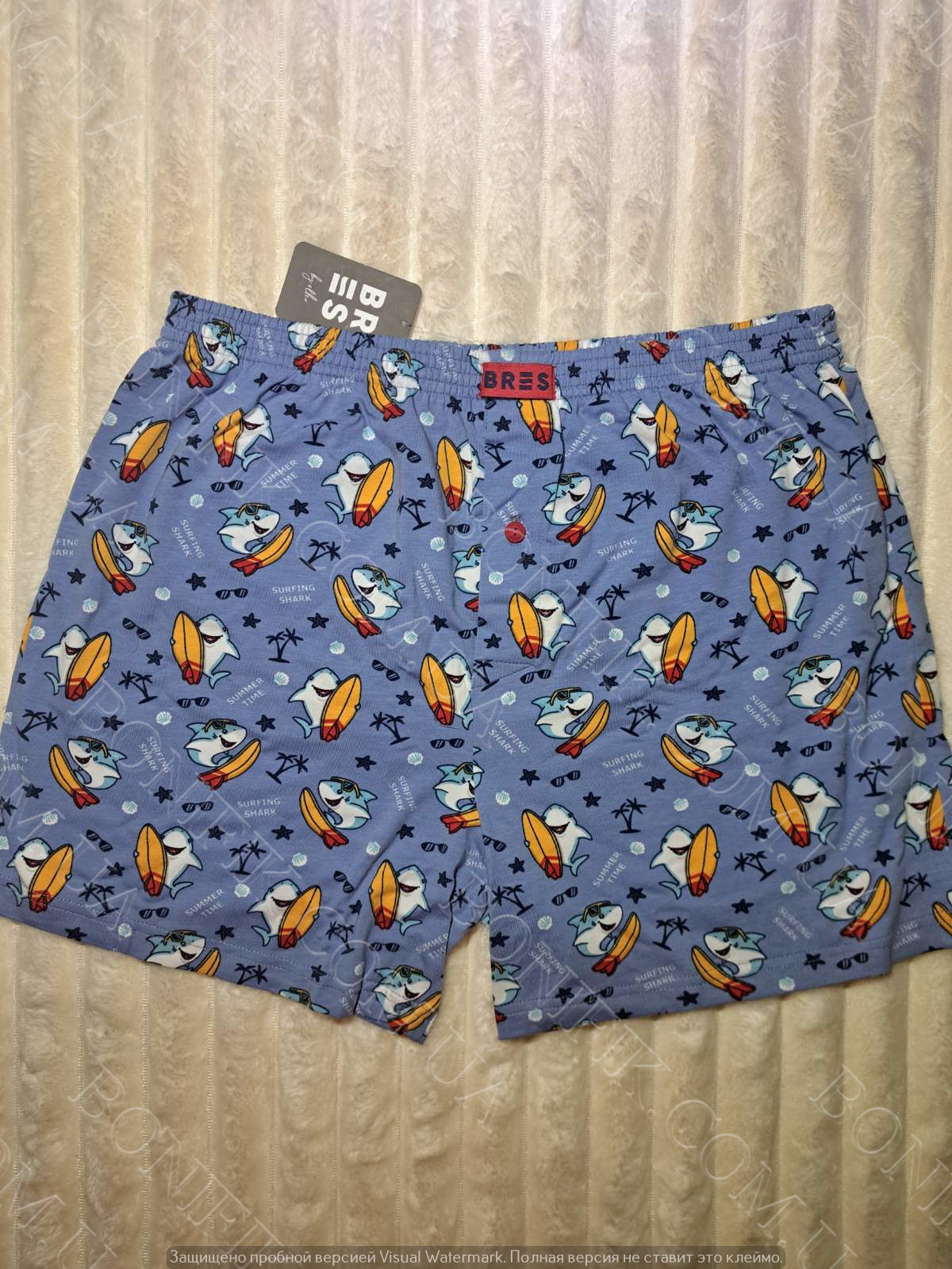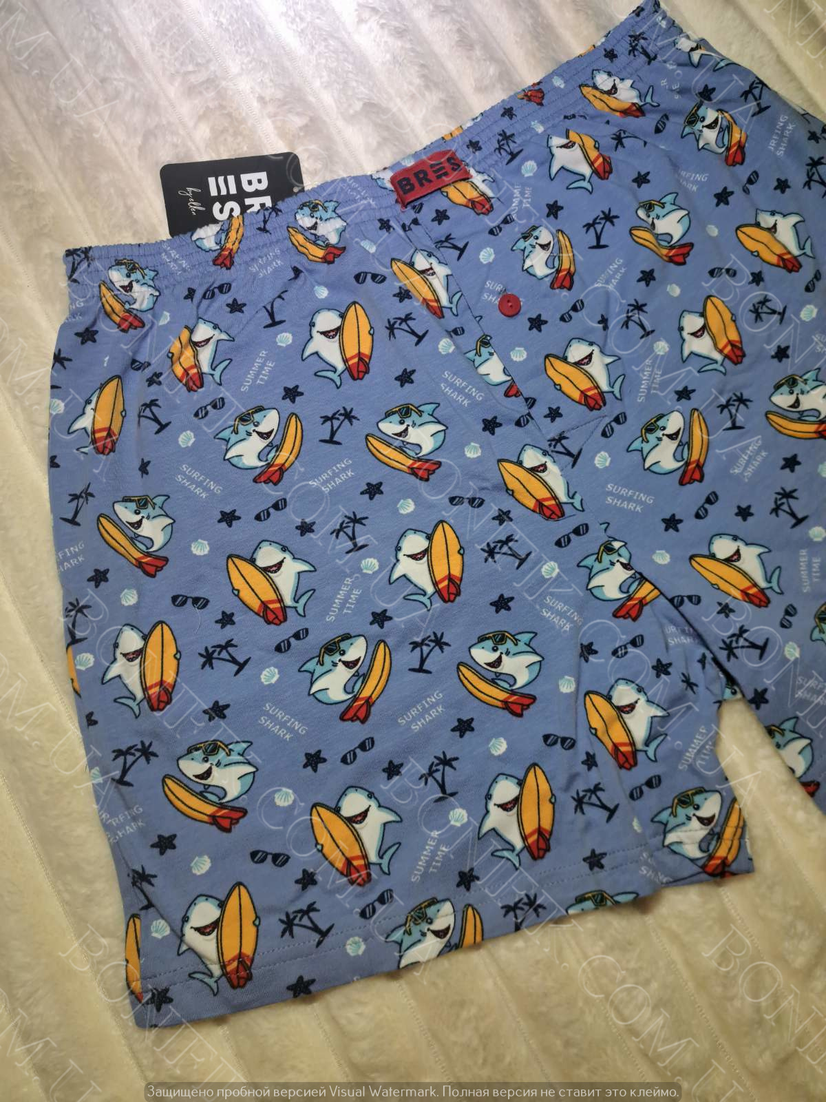 Оригінальний принт з серфящими акулами та яскравими дошками додає образу легкості, гумору та літнього вайбу, роблячи модель не просто базовою білизною, а акцентною деталлю гардеробу.